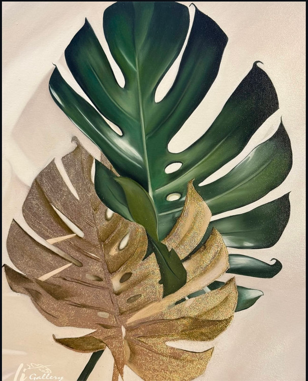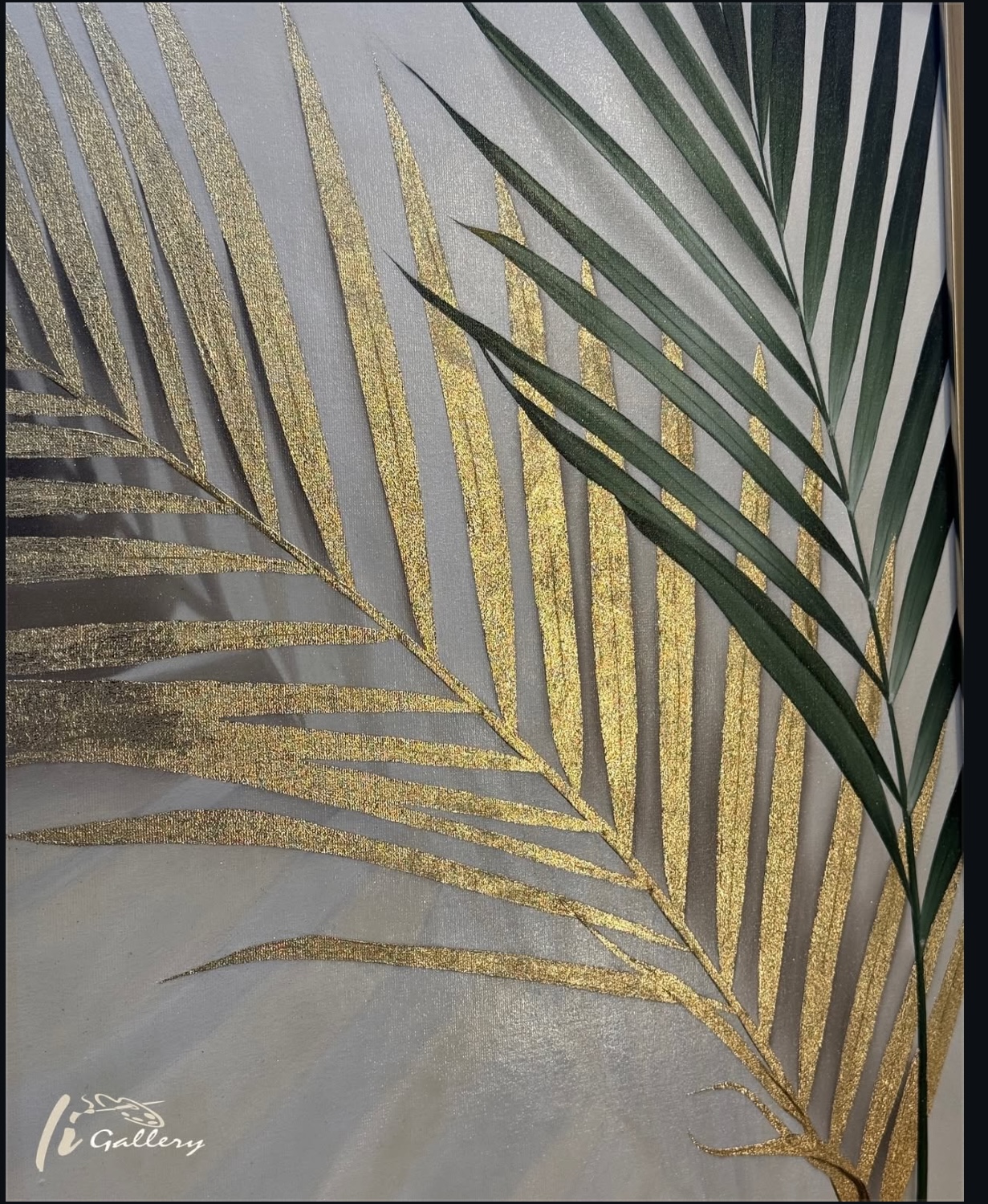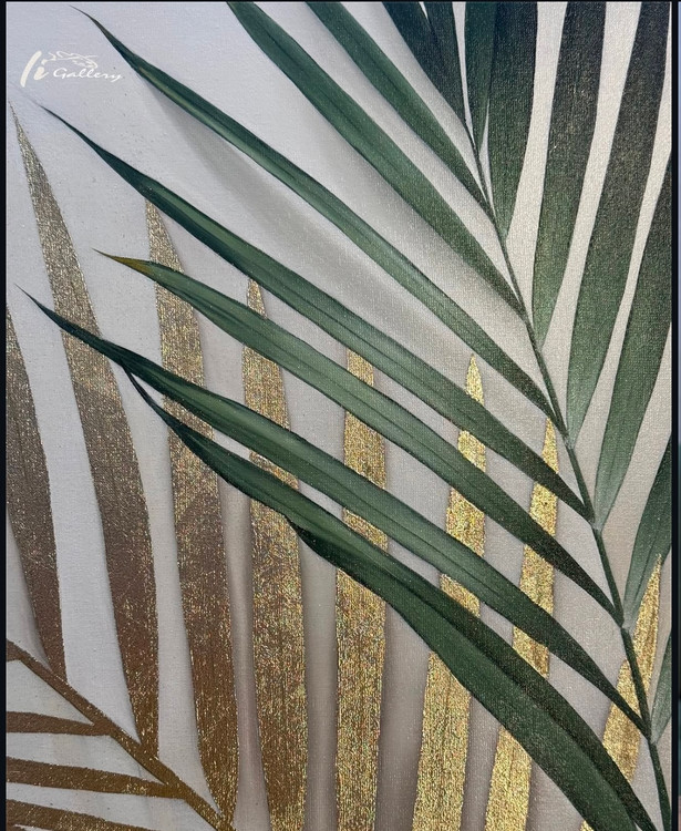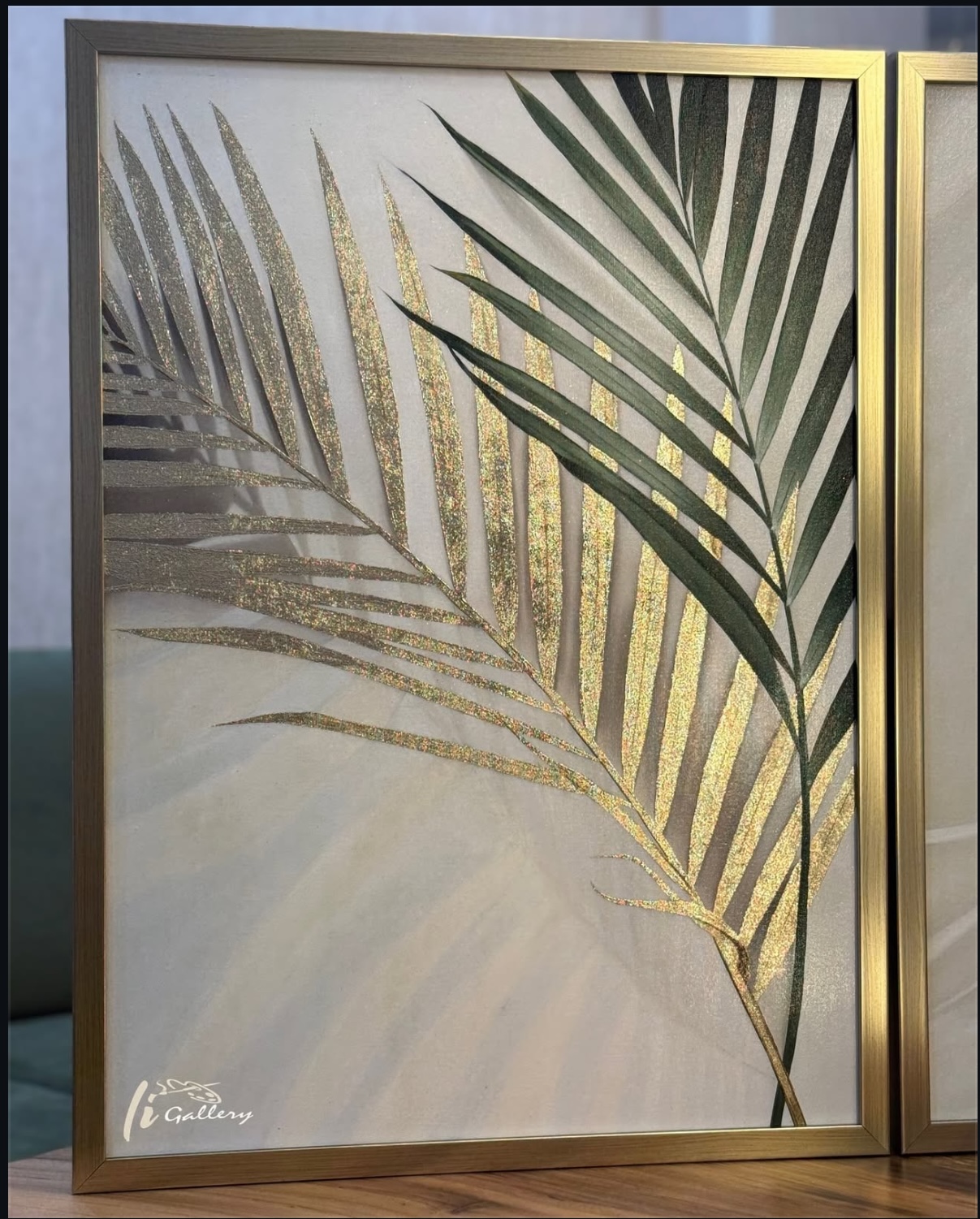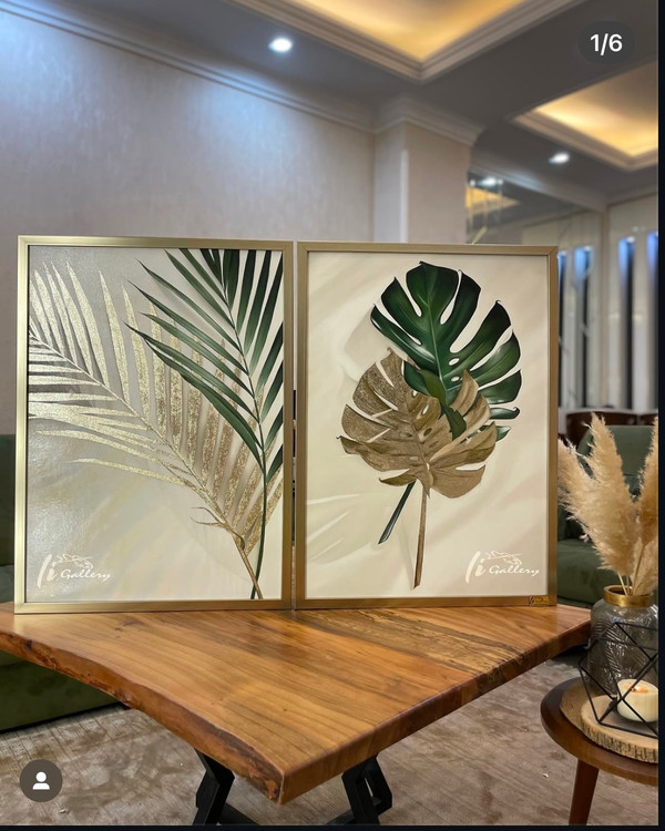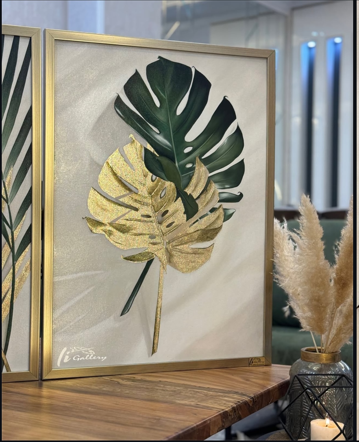 تابلو دو لت برگ انجیر و برگ شامادورا اجرا با رنگ روغن و ورق طلا صفر تا صد هنر دست قابل سفارش در ابعاد دلخواه شما